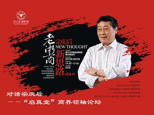 2012年,宗庆后以百亿美元身价登上《福布斯》中国榜榜首。早在八十年代,42岁的他拉着“黄鱼车”奔走在杭州街头推销棒冰,谁知在十多年后,他一手缔造的娃哈哈集团成为了中国最大的饮料企业。这位颇具传奇色彩的浙商是如何管理他的商业航母?本周日(3月31日)下午,娃哈哈集团公司董事长宗庆后将做客浙江大学,将大家领入他的商业帝国。具体信息如下: