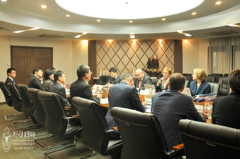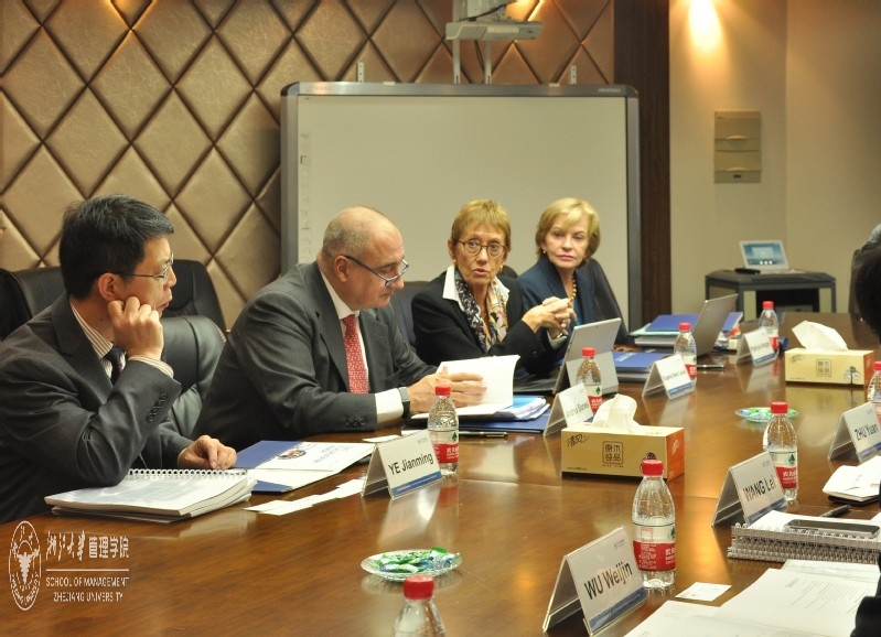 EQUIS专家现场认证。左起:厦门大学管理学院院长叶建明教授、米兰理工大学商学院院长、董事会主席Andrea Sianesi教授、西班牙ESADE商学院总干事Eugenia Bieto Caubet博士、高盛银行非执行董事Patricia Horgan女士