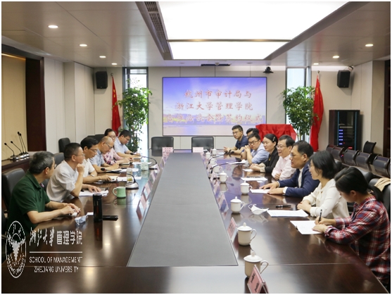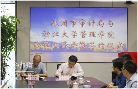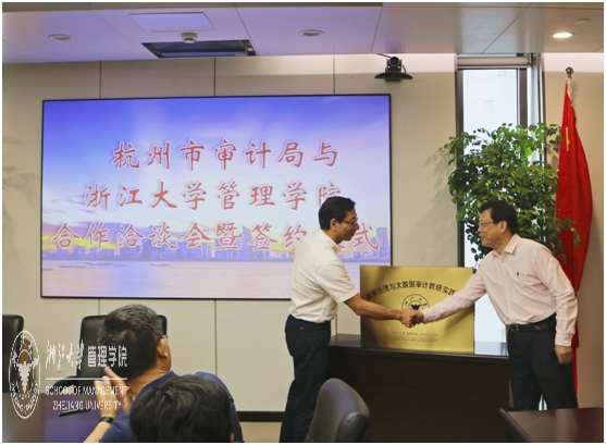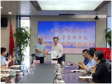 会上,朱原书记代表浙大管理学院与杭州市审计局王坚总审计师签订《杭州市审计局-时博官网平台政校合作框架协议》。