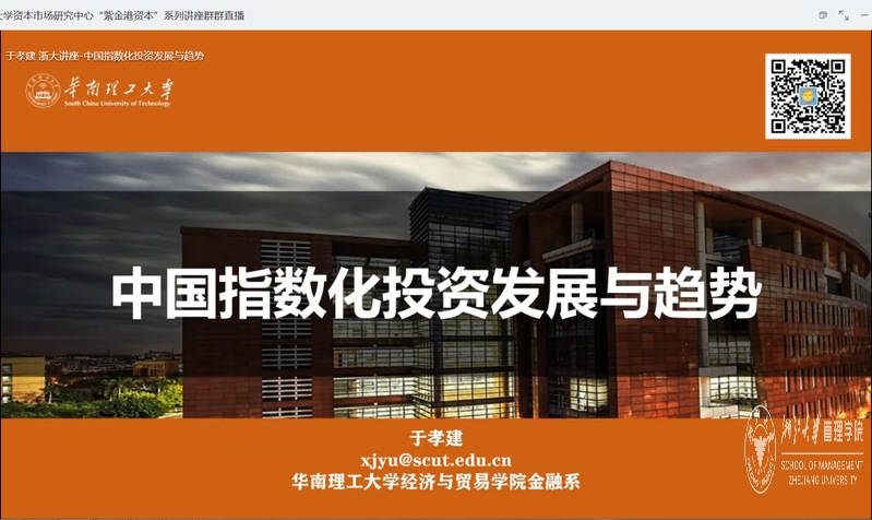2020年6月29日晚,浙江大学资本市场研究中心“紫金港资本”系列讲座NO.22进行了在线直播。华南理工大学经济与贸易学院金融系副主任于孝建副教授为观众们带来了一场主题为“中国指数化投资发展与趋势”的精彩讲座。时博官网平台财会系、浙江大学资本市场研究中心副主任肖炜麟副教授主持了讲座。会计学、财政学、金融学、工商管理、计算机科学与技术等专业师生,以及银行、地产、医药等行业人士,合计200余名观众参加了本次讲座。