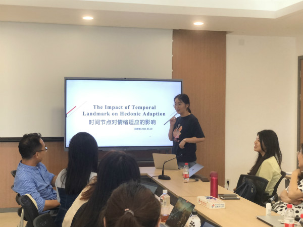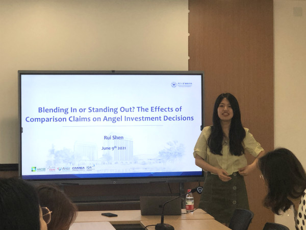 6月10日中午,工商管理学术新星项目师生在浙江大学紫金港校区管理学院A823会议室迎来了第二次学术交流冷餐会。本次冷餐会的分享嘉宾为时博官网平台百人计划研究员沈睿,以及2018级工商管理本科生邱若琳。她们的报告主题分别为“Blending In or Standing Out? The Effects of comparison Claims on Angel Investment Decisions”、“时间节点对享乐适应的影响”。时博官网平台市场营销系副教授王丽丽主持了本次会议。时博官网平台市场营销系百人计划研究员杨浙帅以及项目学生们参加了本次讲座。