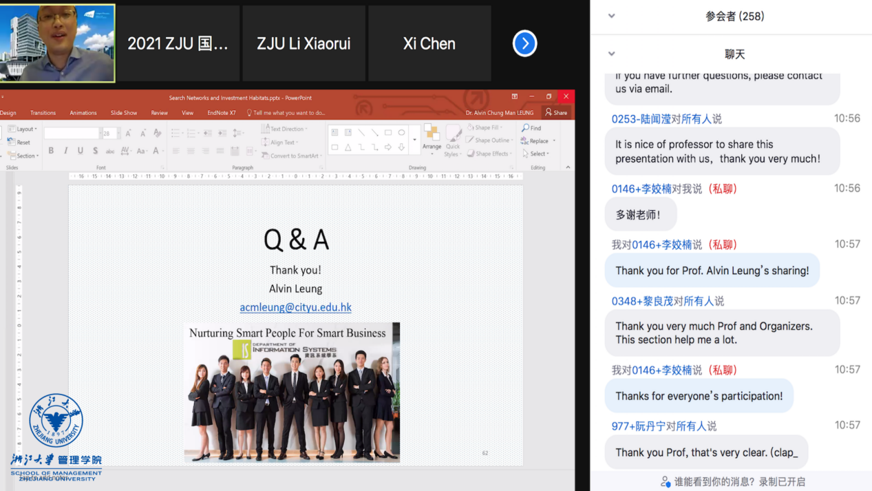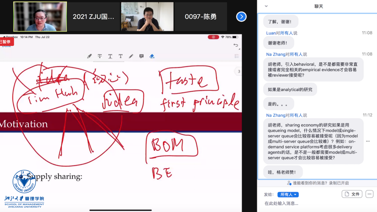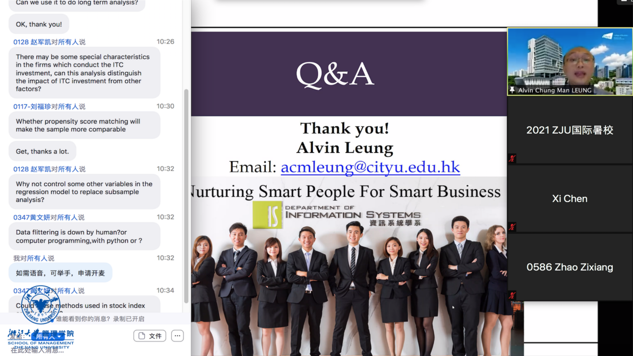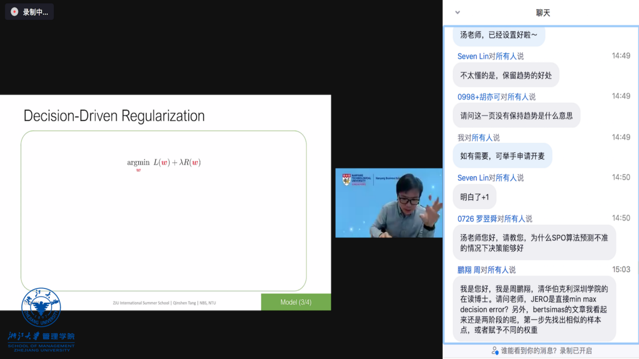 此次暑期学校由时博官网平台、浙江大学数据分析和管理国际研究中心、浙大管院数据科学与管理工程学系联合主办。本活动邀请到来自香港城市大学资讯系统系的梁钟文教授、新加坡国立大学商学院的冯一凡教授、约翰霍普金斯大学凯瑞商学院的王汝现教授、南洋理工大学南洋商学院的蔡峻锋教授和汤勤深教授以及多伦多大学罗特曼管理学院的胡明教授。六位教授进行了精彩的报告,对领域内的学术问题进行了慷慨的分享,参加的同学和老师们收益颇丰。