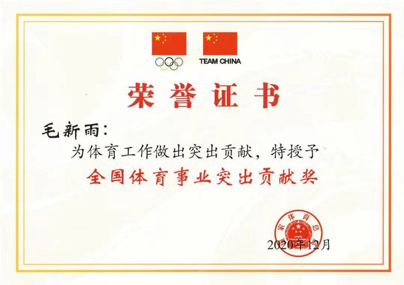 由于多年对国家体育事业的付出和超高的品质把控,毛新雨还获得了2020年全国体育事业突出贡献奖。