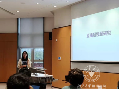 接下来,数据科学与管理工程系主任陈熹老师组内的学姐介绍了陈老师的研究方向,包括直播短视频研究、社交媒体对营销的影响、用户的购买行为机理等。