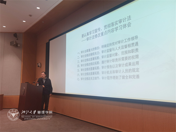 魏江表示,习近平总书记高度重视审计工作,亲自担任中央审计委员会主任,推动审计工作在党和国家监督体系中发挥重要作用。学校和学院高度重视审计工作及相关领域研究,管理学院每年发布的浙江省上市公司内部控制指数报告,已成为国内为数不多的上市公司内控评价方面的重要研究成果。本次有幸邀请孙宝厚博士作专题讲座,不仅是一次宝贵的学习机会,同样是对管理学院莫大的支持与鼓励。