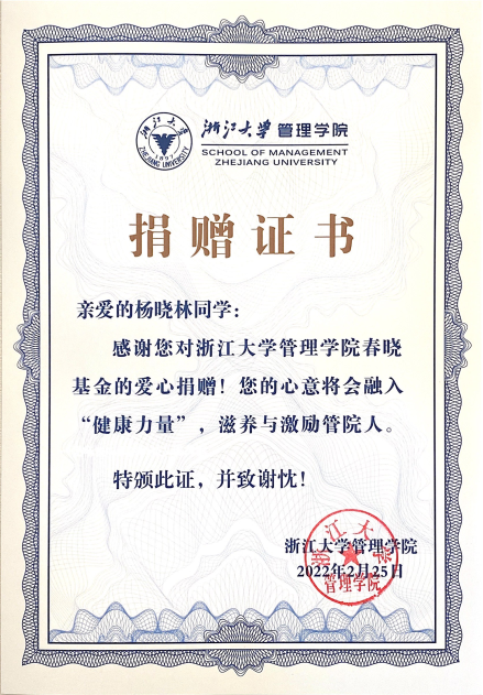 杨晓林在管理学院学习期间,始终将健康力量精神与社会责任根植于心,即便在生命的最后时刻,依然心系母院、想着为管院师生贡献力量。