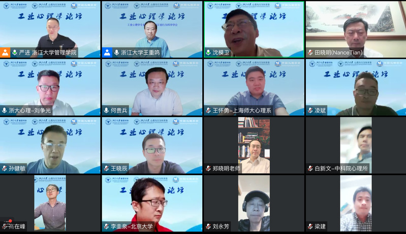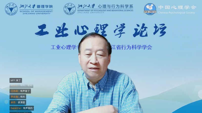 报告结束后,参会嘉宾一一对讲座内容进行了热烈讨论,与王教授交流沟通。浙江大学心理与行为科学系主任何贵兵教授对讲座内容进行了深化吸收,结合心理系的发展定位进行了阐述总结。清华大学领导力与组织管理系郑晓明教授就“幸福感”、“元领导”与“可持续发展”三个方面发表自己的见解。中国人民大学劳动人事学院孙健敏教授、中国科学院心理研究所李永娟教授等对讲座关于工业心理学研究“顶天立地”思想深表认同,赞同扎根于中国组织的实际情景,解决实际问题是学科发展的生命力所在。线上观众们也积极地提出自己的问题和想法,现场交流氛围活跃,在大家热烈的掌声中,本次论坛圆满结束。