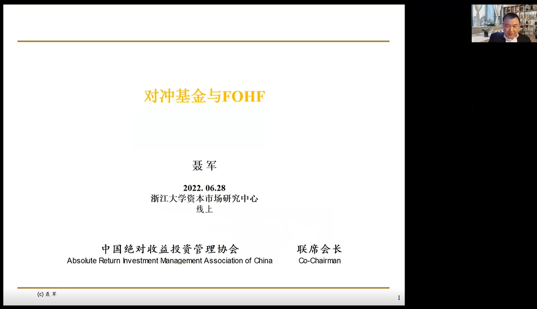 2022年6月28日下午,浙江大学资本市场研究中心“紫金港资本”系列讲座NO.37以线上讲座的形式进行。中国绝对收益投资管理协会联席会长聂军先生为观众们分享了主题为“对冲基金与FOHF”的精彩讲座。此次讲座由浙江大学资本市场研究中心副主任肖炜麟副教授主持。会计、金融、工商管理、工程管理等专业的国内外高校师生,以及银行、证券、投资、电子商务等行业人士,合计260余线上参与了本次讲座。