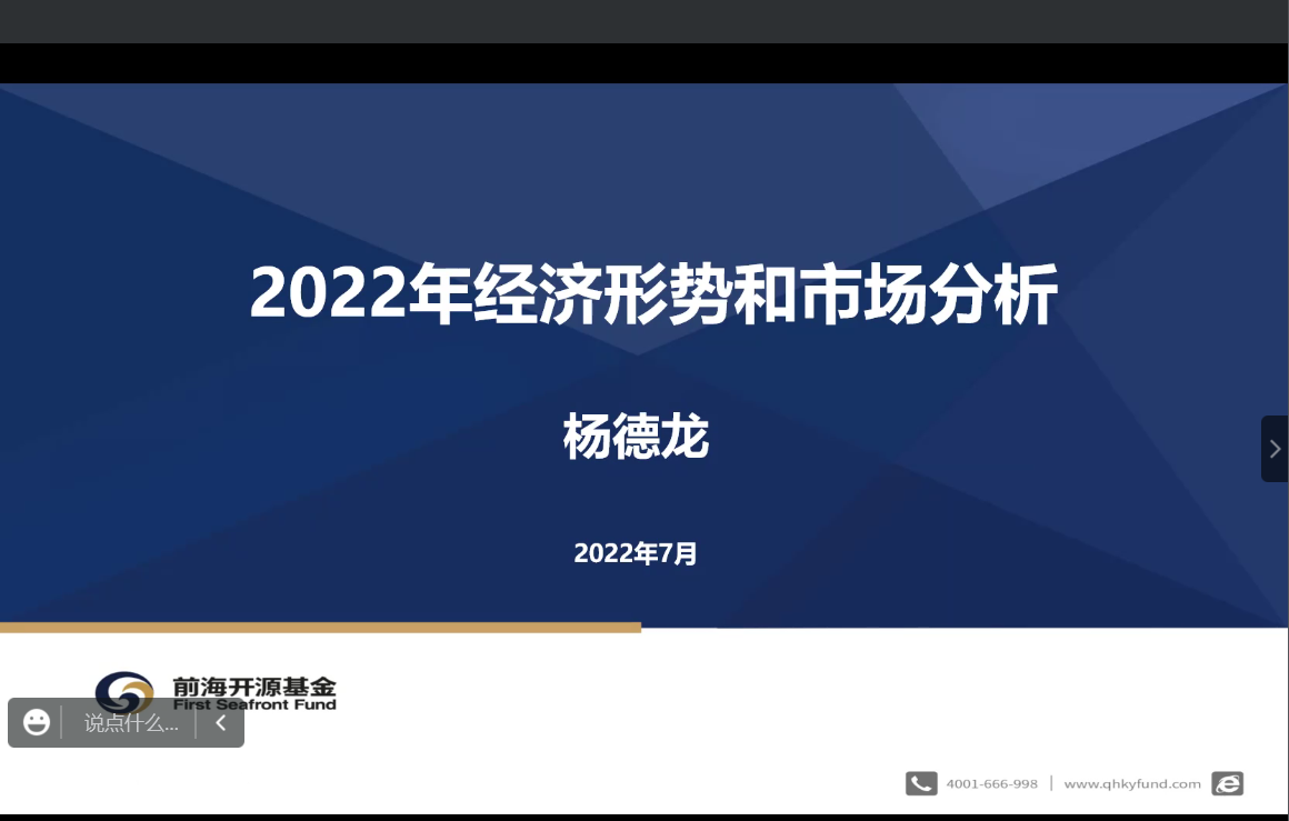 2022年7月13日,浙江大学资本市场研究中心“紫金港资本”系列讲座NO.39以线上讲座的形式进行。前海开源基金董事总经理、首席经济学家杨德龙先生为观众们分享了主题为“2022年宏观经济形势及市场分析”的精彩讲座。此次讲座由浙江大学资本市场研究中心研究员钱美芬副教授主持。会计、金融、工商管理、工程管理等专业的国内外高校师生,以及银行、证券、投资、电子商务等行业人士,合计150余线上参与了本次讲座。