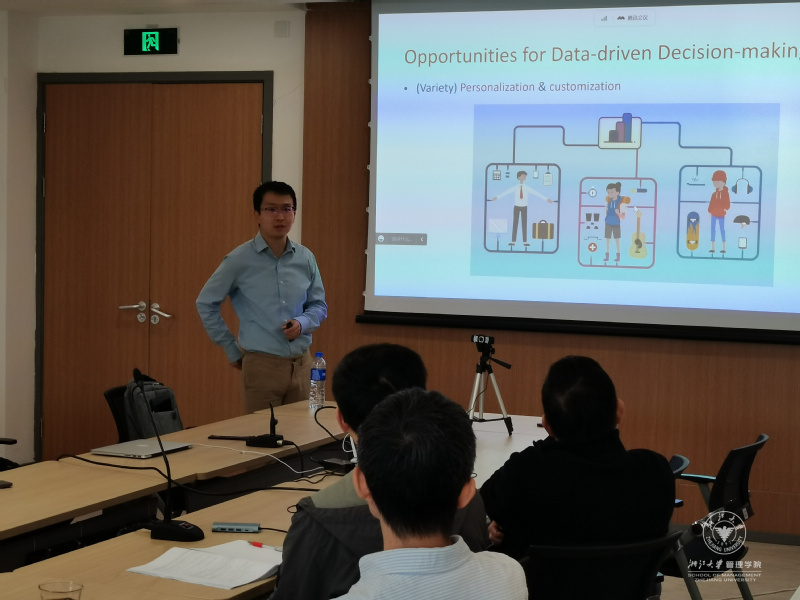 讲座正式开始前,由数据科学与管理工程学系的崔政老师向现场师生介绍了报告人高睿老师。高睿博士毕业于佐治亚理工学院,其研究方向为基于不确定性的数据驱动决策、鲁棒优化等,目前担任数学优化领域国际顶级期刊《Mathematical Programming》的副主编,他的研究工作获得了学界与业界一致认可。