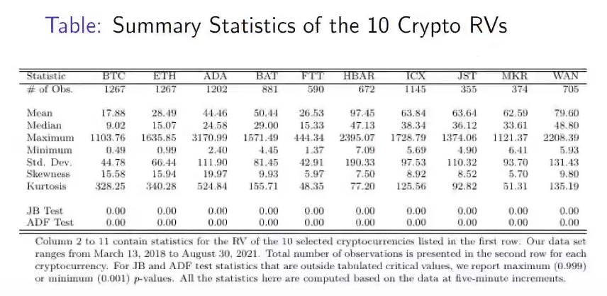 研究计算了10种具有代表性的加密货币的RVs,下图第一行和第一列对应于10种加密货币和各种统计数据以及JB和ADF测试结果。在平静时期,RVs的最小值永远不会超过10,而在动荡的日子,RVs很容易超过1000。