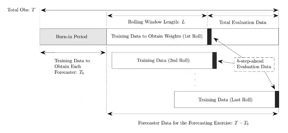 然后,考虑了使用上述10种策略作为候选的六种预测组合方法: