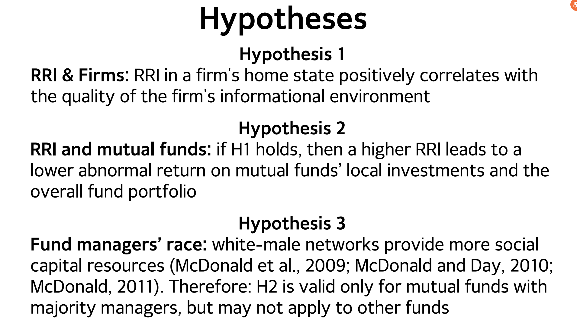 种族居住融合(RRI)是指不同种族/民族的个人居住在给定的地理区域内(例如街区、县、人口普查区、州等)。由于RRI能够增加个人社交网络的多样性,较为集中的社交网络有助于当地企业相关的信息传播,共同基金具有本地优势,在本地投资异常回报率高,高RRI会削弱共同基金可能拥有的本地优势,研究假设:企业所在州的RRI与企业信息环境的质量呈正相关,较高的RRI会导致更低的共同基金本地投资和整体基金投资组合的异常收益率,且这种作用只适用于多数族裔基金经理的共同基金,而不适用于其他基金。