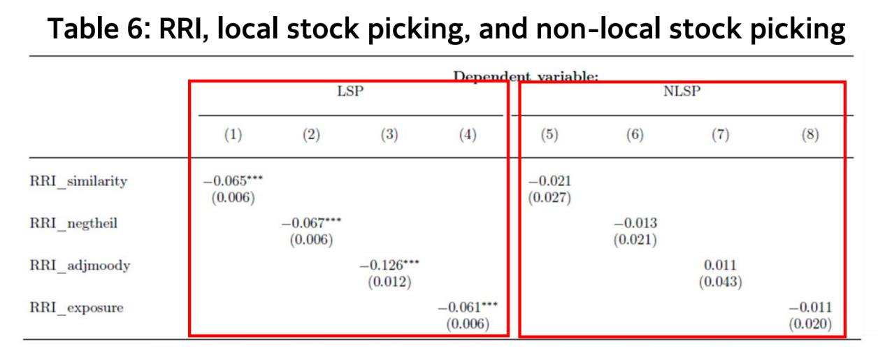另外,研究衡量了基金经理选股业绩,并将其按投资组合公司公司是否处于当地分为当地选股业绩以及非当地选股业绩两组,结果发现较高的RRI显著削弱了基金经理的当地选股业绩,说明RRI减弱了当地的信息优势。进一步的探索发现,在经济繁荣时期,RRI更可能影响基金经理的选股能力。