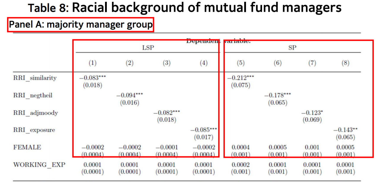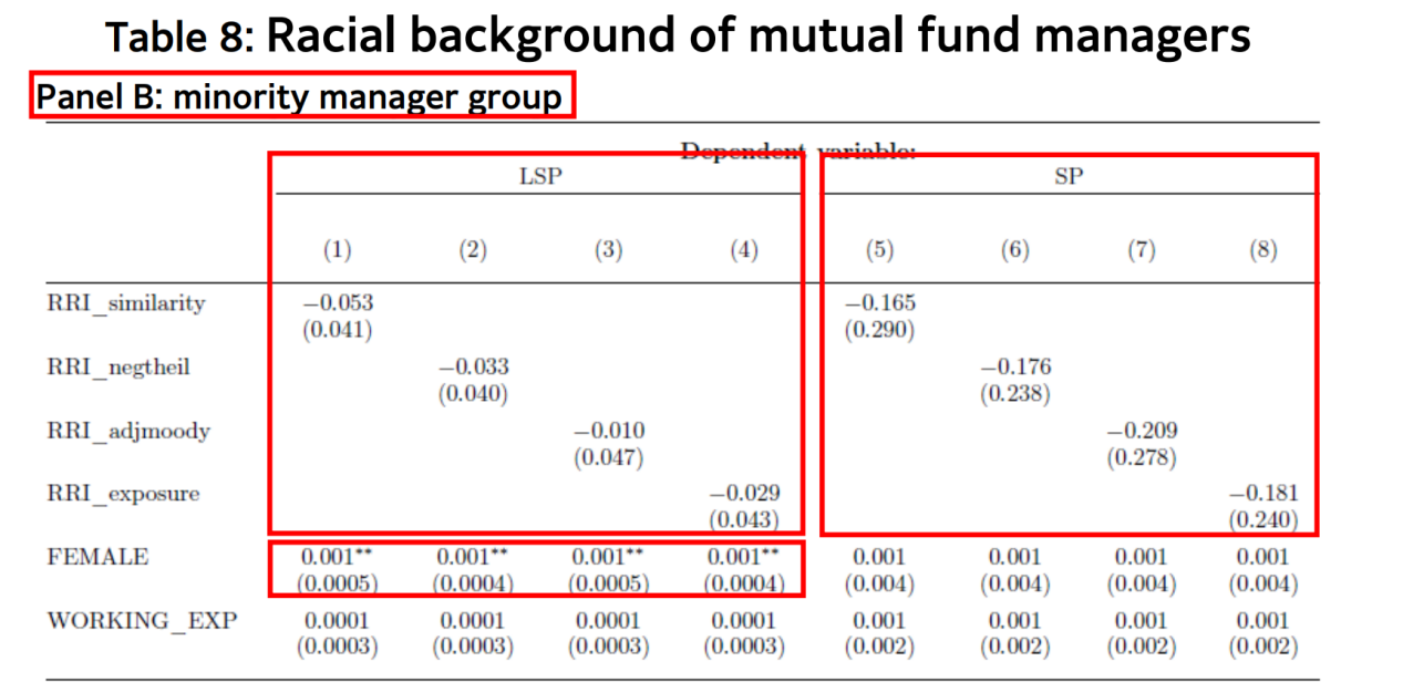 接下来,研究将仅包括一名基金经理的共同基金,按基金经理种族分为多数族裔经理组和少数族裔经理组两组,探究基金经理的种族对RRI与基金经理的整体选股业绩和当地选股业绩之间关系的影响,结果表明RRI显著负向影响多数族裔基金经理的整体选股业绩和当地选股业绩,而少数族裔基金经理则不受影响,并发现少数族裔女性基金经理的经理的当地选股业绩高于男性。