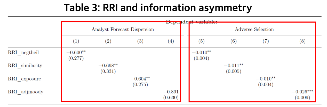 研究构建了相似性指数、负泰尔指数、暴露指数、调整的穆迪指数四个指标度量RRI,并对四个指数进行正交化处理。以分析师盈利预测离散度、买卖价差的逆向选择成分度量企业所处环境的信息不对称性,发现企业所处州RRI越高,企业的分析师盈利预测离散度和买卖价差的逆向选择成分越低,即企业所面临的信息不对称性越低,并进一步证明了RRI与股价信息有效性正相关。