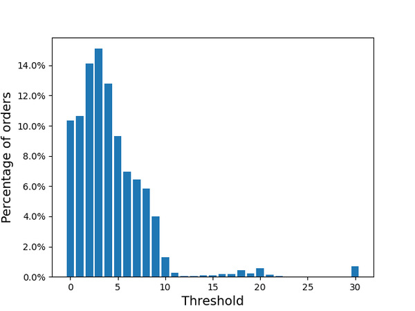 此外,本项研究刻画了最优订单延迟策略的结构,即个性化阈值策略。在电商订单过程中,分属不同用户画像的顾客也分别具有不同的个性化延迟时间阈值。这一阈值可以用来估算顾客延迟订单时间,也就是说,当顾客在该阈值时间内,没有再下新订单时,则不再进行订单延迟。