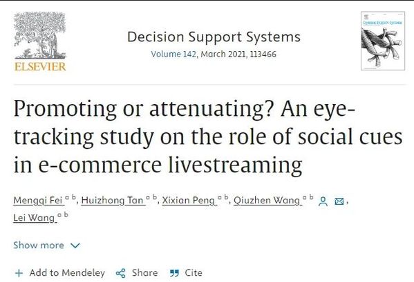 带着这样的疑问,时博官网平台王求真教授、汪蕾教授、彭希羡研究员、博士生费梦琪、谭惠中组成科研团队在信息系统领域重要期刊Decision Support Systems刊发文章Promoting or attenuating? An eye-tracking study on the role of social cues in e-commerce livestreaming。