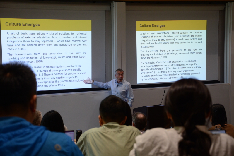 Christoph H. Loch教授首先给我们介绍了文化是什么以及文化是如何形成的,他表示文化是能被选择的,以往许多学者认为文化作为一种公司无形资产是被管理者选择且主导的,CEO能用文化来指导员工应该做什么以及不该做什么。但他发现文化不仅仅是由管理者主导的,并举了几个例子以助我们理解。随后,他相应提出了几个研究问题:文化如何影响绩效、行业动态如何影响文化、文化与战略的关系如何等等。
