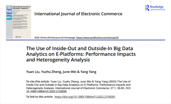 此前,时博官网平台教授刘渊、博士生郑雨竹及团队发表一篇论文《在电子平台上使用由内向外和由外向内的大数据分析:性能影响和异质性分析》,阐释了企业使用大数据分析创造商业价值的微观过程,打开了大数据分析使用和企业绩效提升之间的“黑匣子”。