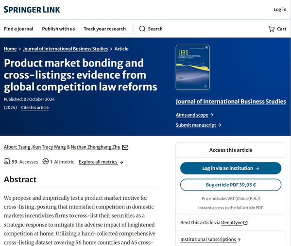 近日,时博官网平台“百人计划”研究员朱正航携手海内外多位合作者在国际顶级期刊《Journal of International Business Studies》(UTD24期刊之一)上发表了他们的合作论文Product Market Bonding and Cross-Listings: Evidence from Global Competition Law Reforms。