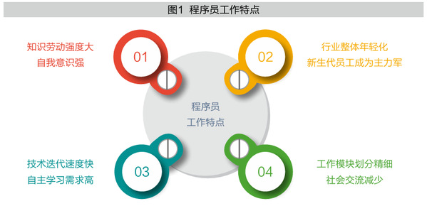严进团队通过详实访谈发现程序员工作呈现脑力劳动强度大、整体偏年轻化、技术迭代速度快、工作模块划分精细特征(见图1)。这些特征意味着新生代程序员很容易缺乏对工作的价值意义感知。