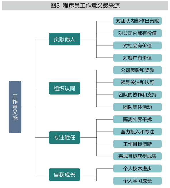 他们招募了公司参加过封闭式项目开发的20名新生代程序员,平均年龄27.4岁,分别进行了一小时左右的半结构化访谈,提练出程序员的工作意义感模型(见图3)。