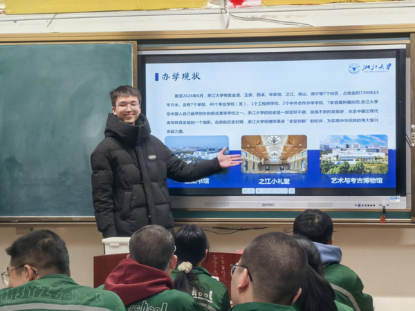 寒假期间,实践团的学子们回到高中母校,在熟悉的教室里,以“浙大故事”为引讲述百廿校史中的求是精神,分享实验室里的创新突破、图书馆中的奋斗日夜和社团活动的青春活力。