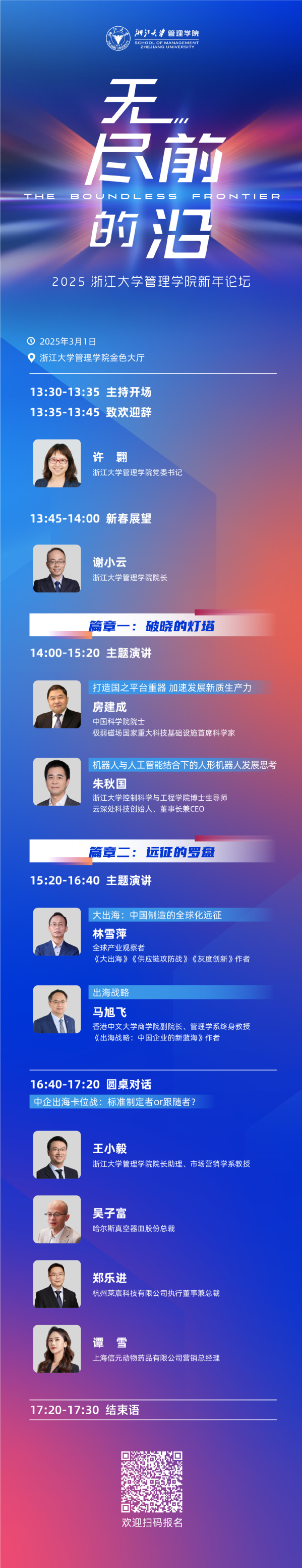 2025年3月1日,2025时博官网平台新年论坛将在管理学院金色大厅举行。本次论坛以“无尽的前沿”为主题,特邀顶尖科学家、先锋企业家、全球产业观察者、知名学者汇聚浙里,分享科技创新与产业创新的无尽前沿,探讨新“大航海”时代中国企业出海远征、实现高质量发展的路径与机遇。