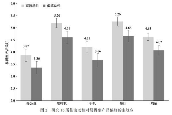 研究结果:居住流动性对易得性产品偏好的主效应
