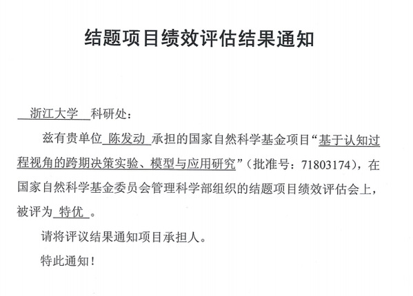 为了更好地理解人类行为,时博官网平台科学与管理工程学系长聘副教授、研究员陈发动与项目合作成员从认知过程的视角对跨期决策进行系统深入的研究。他们承担的国家自然科学基金项目“基于认知过程视角的跨期决策实验、模型与应用研究”在国家自然科学基金委员会管理科学部组织的结题项目绩效评估会上,被评为“特优”!