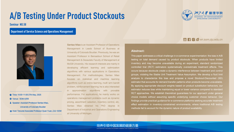 Sentao Miao is an Assistant Professor of Operations Management in Leeds School of Business at University of Colorado Boulder. Previously, he was an Assistant Professor in Bensadoun School of Retail Management & Desautels Faculty of Management at McGill University. His research interests are mainly in developing efficient learning and optimization algorithms with various applications in Operations Management. For methodologies, Sentao Miao focuses on statistical and machine learning algorithms such as online learning, multi-arm bandit problem, reinforcement learning; he is also interested in approximation algorithms with provable performance. For applications, he mainly works on operations management problems such as dynamic pricing, assortment selection, inventory control, etc. Sentao Miao obtained his PhD degree in Department of Industrial and Operations Engineering at University of Michigan.
