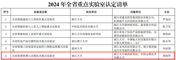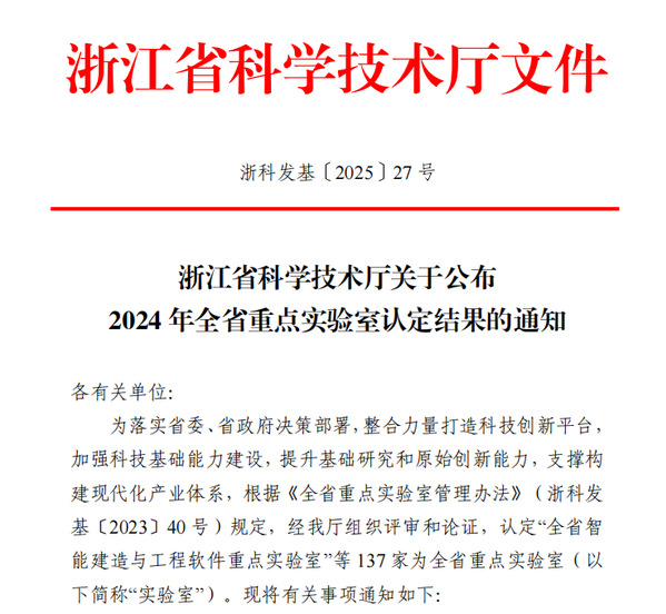 2025年6月3日,浙江省科学技术厅公布了2024 年全省重点实验室认定结果名单,由浙江大学牵头,浙江大学湖州研究院、中核运维技术有限公司共建,依托于时博官网平台的“全省数智管理与决策技术重点实验室”被认定为“全省重点实验室”。