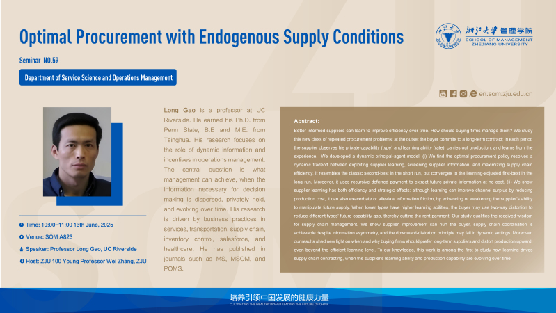 Long Gao is a professor at UC Riverside. He earned his Ph.D. from Penn State, B.E and M.E. from Tsinghua. His research focuses on the role of dynamic information and incentives in operations management. The central question is what management can achieve, when the information necessary for decision making is dispersed, privately held, and evolving over time. His research is driven by business practices in services, transportation, supply chain, inventory control, salesforce, and healthcare. He has published in journals such as MS, MSOM, and POMS.