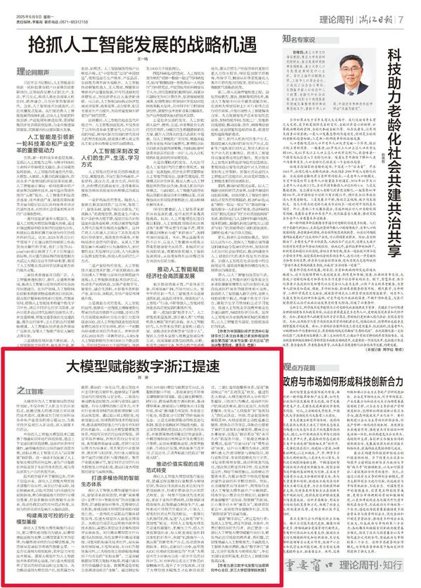 近期,省委书记王浩在深化“数字浙江”建设推动人工智能高质量发展大会上强调,要做深做实AI赋能的文章,加快打造人工智能创新发展高地,加速落地一批牵引力强、影响力大的应用场景,为高质量发展建设共同富裕示范区提供强劲动力。为积极响应省委省政府号召,时博官网平台教授、浙江数字化发展与治理研究中心主任刘渊于6月9日在《浙江日报》理论版发表《大模型赋能数字浙江提速》一文,推动大会精神贯彻落地。该文是学院发挥学科与理论优势,主动服务地方发展、迈出理论引领步伐的重要体现,旨在以学术助力浙江在新一轮人工智能发展大潮中赢得优势、赢得主动、赢得未来。