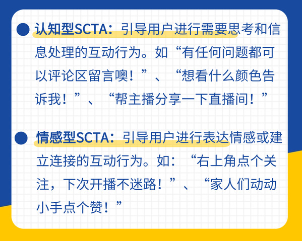 过往研究多关注购物主持人的“非指令性社交操作”(如问候、感谢),却忽视了电商直播特有的“指令性社交行动呼吁”(Social Call-to-Actions,SCTAs)——即主播明确引导观众使用社交功能(点赞、评论、分享、关注)的行为。SCTAs可分为认知型和情感型。所谓“认知型社交行动呼吁”,是指那些需要观众进行有意识、较慢、更审慎思考的互动引导,例如鼓励观众发送实时聊天、分享直播链接等。这些行为通常需要观众付出更多的认知努力,比如组织语言、选择分享对象等。而“情感型社交行动呼吁”则是激发观众快速、本能的情感反应,例如点击“点赞”按钮、关注主播等,这些行为往往只需简单的一键操作,不需要太多思考。