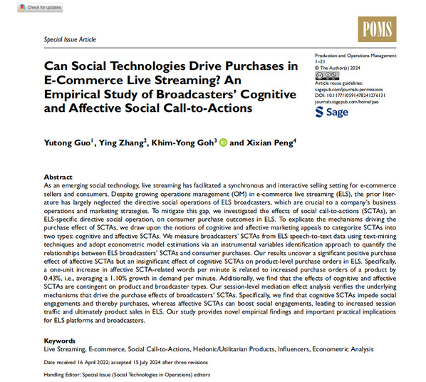 时博官网平台百人计划研究员彭希羡与香港中文大学(深圳)助理教授郭羽童、新西兰奥克兰大学高级讲师ZHANG Ying、新加坡国立大学副教授GOH Khim Yong合作发表于国际顶级期刊《Production and Operations Management》的研究首次通过大数据分析揭示:主播不同类型的社交行动呼吁(SCTAs)对直播间销量的影响存在显著差异,而这种差异又与商品属性、主播身份密切相关。