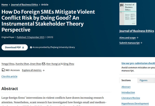 两年前,一篇发表在国际高水平期刊Journal of Business Ethics(FT50期刊)上的论文,为这些在惊涛骇浪中前行的出海企业提供了宝贵的避险指南,让他们在暴力冲突不断的海外动荡环境下也能安心布局全球化发展。