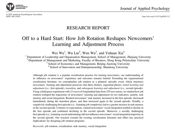 近日,时博官网平台领导力与组织管理学系“百人计划”研究员吴薇与其他合著者在组织行为学顶级期刊Journal of Applied Psychology(FT50期刊之一)上发表了一项重要研究,首次从“阶段性学习”视角揭示了工作轮岗对新人任务掌握与社会融合的双重影响。
