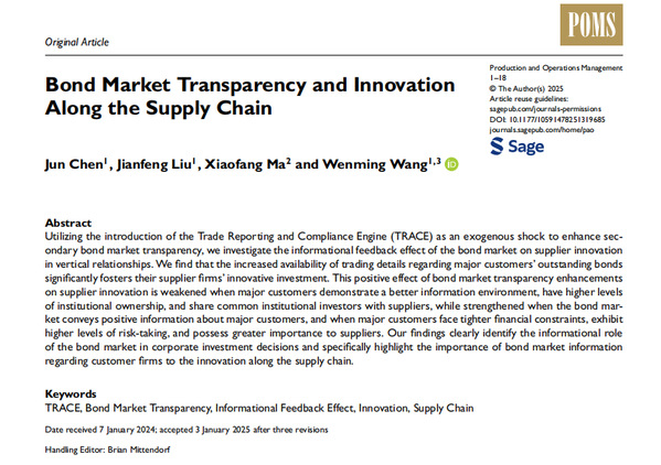 债券市场透明度的提升,就像为供应商打开了一扇窗户,让他们能够通过债券交易信息更清晰地了解客户的真实情况。而透明度提升究竟如何影响供应商的创新决策,一直是学界和业界关注的焦点。时博官网平台研究团队今年发表在管理学顶级期刊Production and Operations Management上的研究揭示:当客户发行的债券交易信息变得更透明时,客户的供应商们纷纷加大了创新投入。