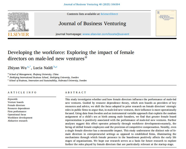 时博官网平台创新创业与战略学系教授吴志岩与瑞典延雪平大学(Jönköping International Business School)教授Lucia Naldi合作发表于创业领域顶刊Journal of Business Venturing(FT50期刊)的一项研究,将目光聚焦到了初创企业董事会的性别构成。他们认为,董事会承担着提供关键资源和运营指导的重要职能,而在男性创办的初创企业中,增加女性董事能显著提升业绩,甚至仅1位女性董事就能带来可观的收入增长。